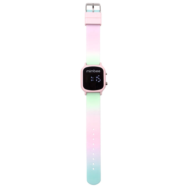 Brighten up their day with our Mimbee - Gradient LED Watch, featuring a playful fade of pink, green, and blue. The bold LED display makes it easy to spot the time, even in the dark, with just the push of a button. Kids can quickly check the time, date, and seconds, making it a fun and practical way to start learning about time management.